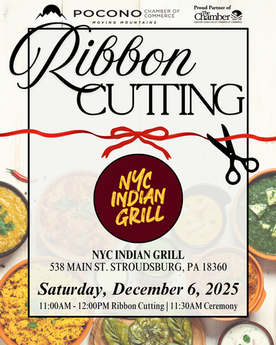 The Pocono Chamber of Commerce is excited to welcome NYC Indian Grill to the community! Join us for the Ribbon Cutting THIS SATURDAY, December 6th, from 11:00AM to 12:00PM, with the ceremony at 11:30AM. Come celebrate and support this amazing new business in the Poconos!
