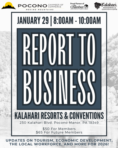 The Pocono Chamber of Commerce is proud to host the Annual Report to Business Breakfast as we start off another year! Join us for a networking session over breakfast followed by presentations on Tourism, Economic Development, and the Local Workforce!